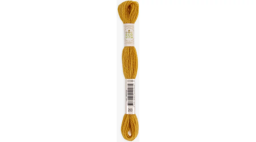 DMC Eco Vita hímzőfonal 100%-ban organikus, merinó gyapjú tartalmú fonal. Teljesen természetes összetevőkkel festették például dió, rebarbara, indigó és boróka. Az Eco Vita egy nagyon sokoldalú cérna, amely a kézműves technikák széles skálájához alkalmas. Egyenletes vastagsága és finom csavarása tökéletes kézi hímzéshez, keresztszemes hímzéshez, lyukasztótűhöz, szövéshez és javításhoz. A gyapjúszálat egyszálúként használják, és nem oszthatók. Körülbelül ugyanolyan vastagságú, mint a DMC Mouliné Spécial három szála. Hossza 16 méter.