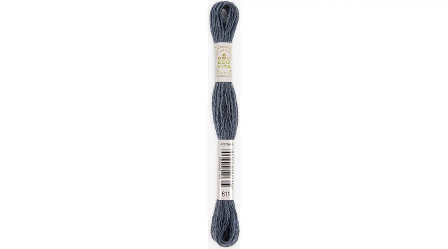DMC Eco Vita hímzőfonal 100%-ban organikus, merinó gyapjú tartalmú fonal. Teljesen természetes összetevőkkel festették például dió, rebarbara, indigó és boróka. Az Eco Vita egy nagyon sokoldalú cérna, amely a kézműves technikák széles skálájához alkalmas. Egyenletes vastagsága és finom csavarása tökéletes kézi hímzéshez, keresztszemes hímzéshez, lyukasztótűhöz, szövéshez és javításhoz. A gyapjúszálat egyszálúként használják, és nem oszthatók. Körülbelül ugyanolyan vastagságú, mint a DMC Mouliné Spécial három szála. Hossza 16 méter.