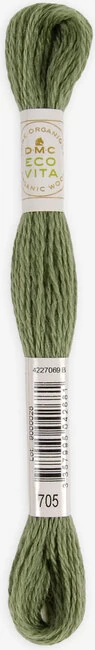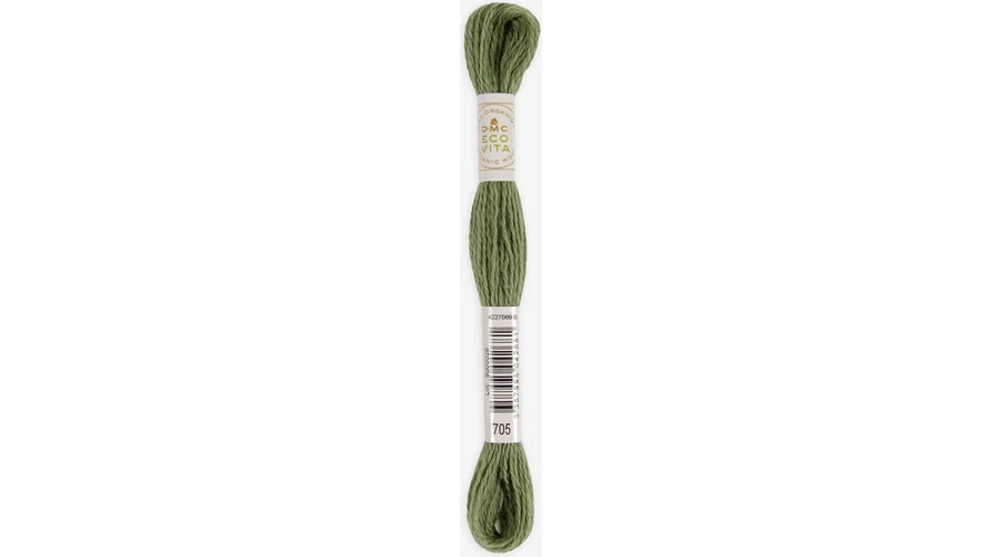 DMC Eco Vita hímzőfonal 100%-ban organikus, merinó gyapjú tartalmú fonal. Teljesen természetes összetevőkkel festették például dió, rebarbara, indigó és boróka. Az Eco Vita egy nagyon sokoldalú cérna, amely a kézműves technikák széles skálájához alkalmas. Egyenletes vastagsága és finom csavarása tökéletes kézi hímzéshez, keresztszemes hímzéshez, lyukasztótűhöz, szövéshez és javításhoz. A gyapjúszálat egyszálúként használják, és nem oszthatók. Körülbelül ugyanolyan vastagságú, mint a DMC Mouliné Spécial három szála. Hossza 16 méter.