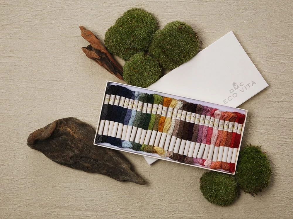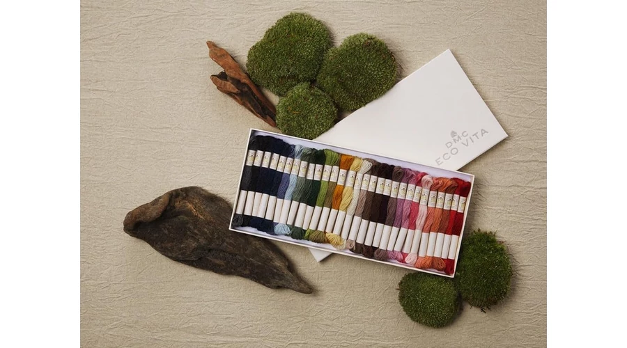 DMC limitált díszdoboza 30 darab DMC Eco Vita bio gyapjú hímzőfonalat tartalmaz + 1 gyönyörű hímző mintaívvel kiegészítve, az egyik keresztszemes, a másik klasszikus öltés minta.