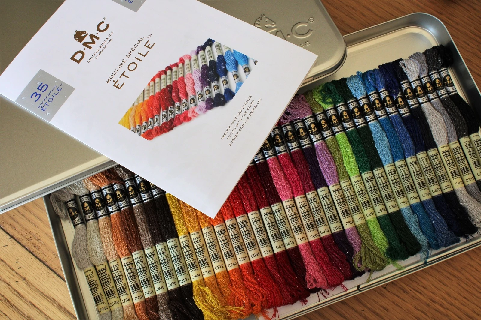 A fém díszdoboz tartalmaz 35 új DMC Etoile Mouliné osztott, csillogó hímzőfonalat.