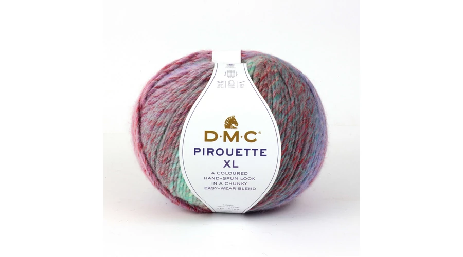 DMC Piruette XL egy többszínű, terjedelmes, kézzel fonott, gyapjútartalmú fonal, mely alkalmas őszi, téli ruházat pl. sapka, sál, pulóver, kardigán, poncsó elkészítéséhez. Nagyon puha, kellemes tapintású fonal, mely gyapjú tartalmának köszönhetően nagyobb melegséget ad. Öt színű színskálával rendelkezik Könnyen és gyorsan köthető, horgolható, ideális takaró készítéséhez is.
