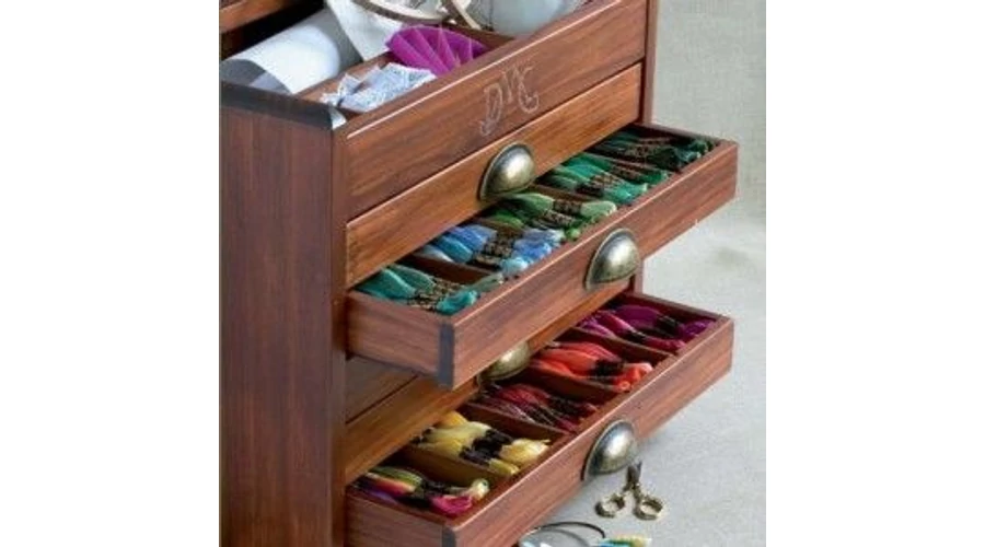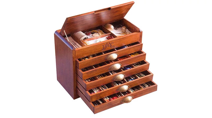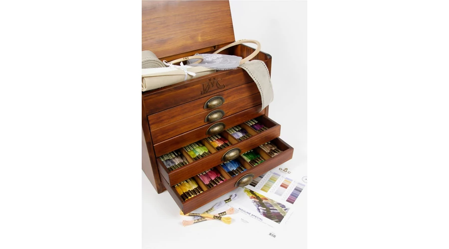 DMC által gyönyörűen kidolgozott, tömör fából készített tárolódoboz 500 darab DMC Mouliné fonalat tartalmaz, minden színből egyet. A tároló tetején lecsukható fedél található, amely könnyű hozzáférést biztosít a felső nagy részhez, ahol apró kiegészítőknek ad helyet.