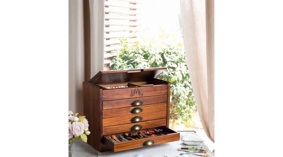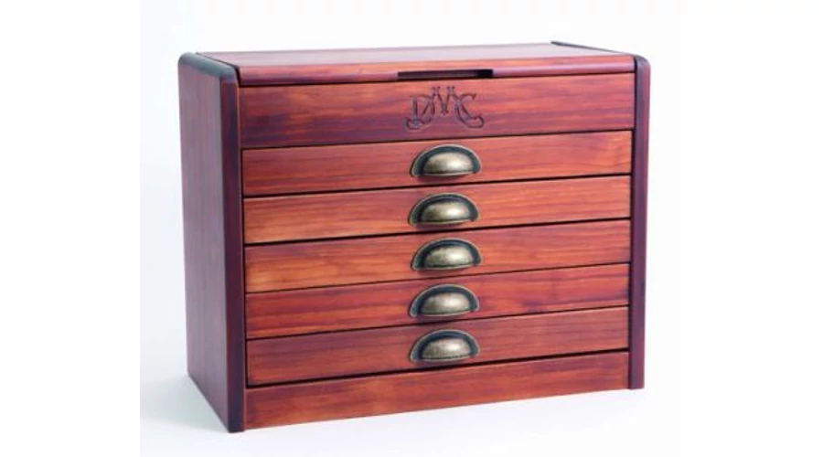 A doboz 5 kihúzható fiókkal, benne eltávolítható elválasztóval rendelkezik. Réz fogantyú és DMC logó teszi elegánssá ezt a  egyedi, tökéletesen kivitelezett fa tárolót.