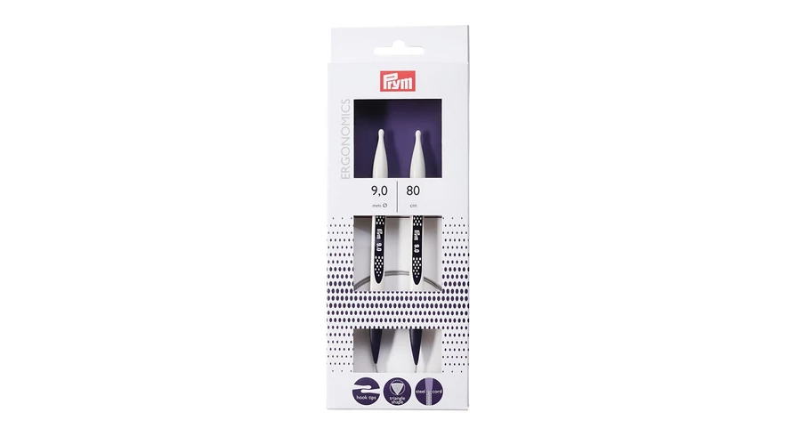 Könnyebbé, kényelmesebbé teszi a kötést. A körkötőtű szintetikus anyagból készült, hajlítható. Ez az anyag biztosítja a csendes kötést is, így nincsenek zörgő zajok. A csepp alakú pont segítségével a prym ergonomikus kötőtűk jól illeszkedik a kezdők kezében, mert a menetvezetés sokkal könnyebb, és a fonal nem csúszik le olyan gyorsan. A tűk alakjának megváltoztatása miatt, az öltések könnyen felszedhető a tűtesten. A kör alakú kötőtű stabil, nagyon finom acélzsinórját kiváló minőségű szintetikus anyag borítja. Itt nincs spirálhatás, a zsinór nem gubancolódik össze. A kiválasztott fonal vastagságához válasszon megfelelő méretű kötőtűt.