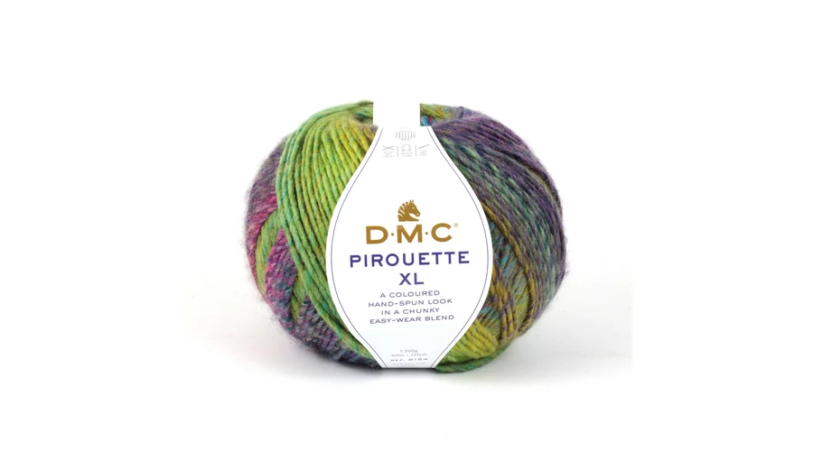 DMC Piruette XL egy többszínű, terjedelmes, kézzel fonott, gyapjútartalmú fonal, mely alkalmas őszi, téli ruházat pl. sapka, sál, pulóver, kardigán, poncsó elkészítéséhez. Nagyon puha, kellemes tapintású fonal, mely gyapjú tartalmának köszönhetően nagyobb melegséget ad. Öt színű színskálával rendelkezik Könnyen és gyorsan köthető, horgolható, ideális takaró készítéséhez is.