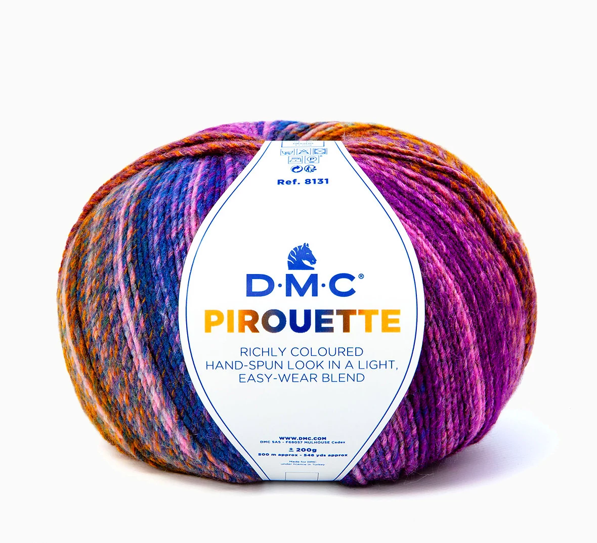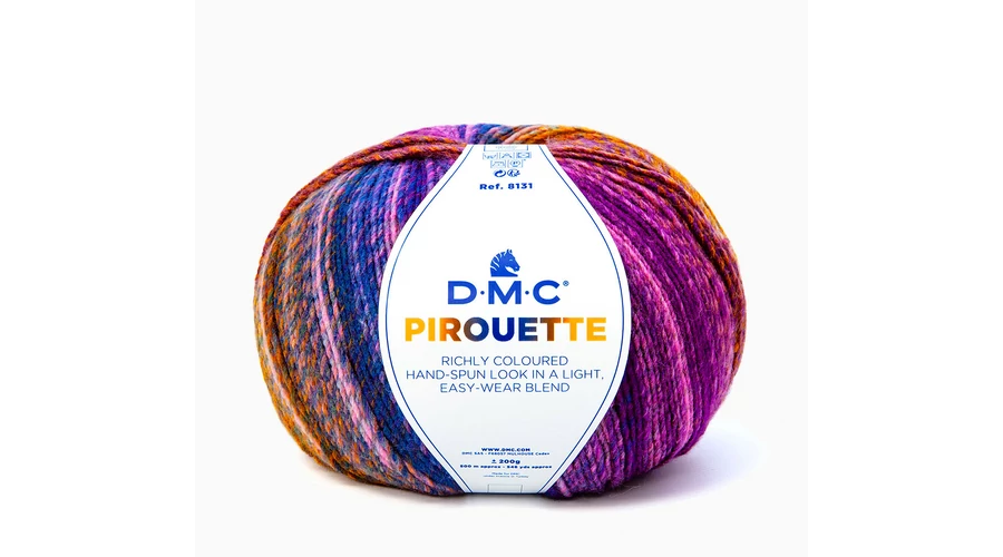 Piruette a DMC egyik legnépszerűbb kötőfonala. Többszínű, melynek színváltozása finom átmenetet képez, ami nagyon természetes megjelenést kölcsönöz a fonalnak. 100 % akril tartalmú fonal, mely alkalmas őszi, téli ruházat pl. sapka, sál, pulóver, kardigán, poncsó elkészítéséhez. Nagyon puha, meleg,kellemes tapintású fonal. Öt színű színskálával rendelkezik Könnyen és gyorsan köthető, horgolható, ideális takaró készítéséhez is.