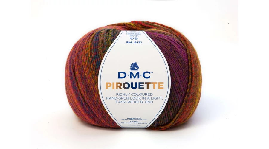 Piruette a DMC egyik legnépszerűbb kötőfonala. Többszínű, melynek színváltozása finom átmenetet képez, ami nagyon természetes megjelenést kölcsönöz a fonalnak. 100 % akril tartalmú fonal, mely alkalmas őszi, téli ruházat pl. sapka, sál, pulóver, kardigán, poncsó elkészítéséhez. Nagyon puha, meleg,kellemes tapintású fonal. Öt színű színskálával rendelkezik Könnyen és gyorsan köthető, horgolható, ideális takaró készítéséhez is.
