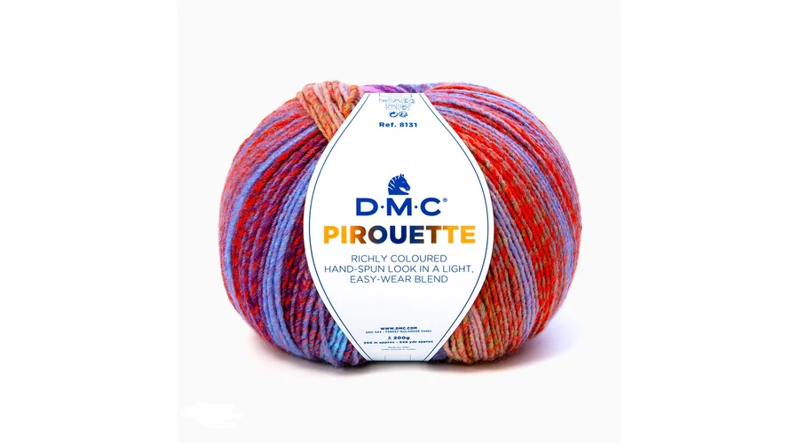 Piruette a DMC egyik legnépszerűbb kötőfonala. Többszínű, melynek színváltozása finom átmenetet képez, ami nagyon természetes megjelenést kölcsönöz a fonalnak. 100 % akril tartalmú fonal, mely alkalmas őszi, téli ruházat pl. sapka, sál, pulóver, kardigán, poncsó elkészítéséhez. Nagyon puha, meleg,kellemes tapintású fonal. Öt színű színskálával rendelkezik Könnyen és gyorsan köthető, horgolható, ideális takaró készítéséhez is.