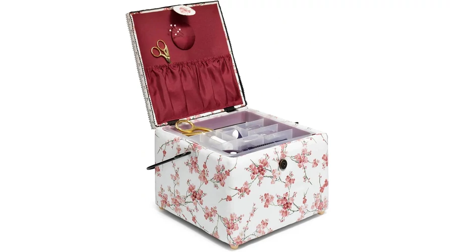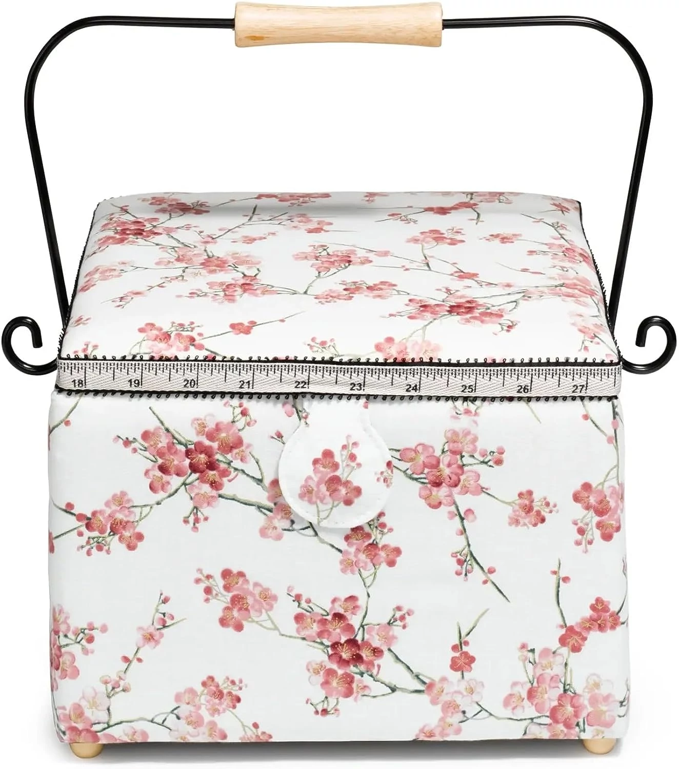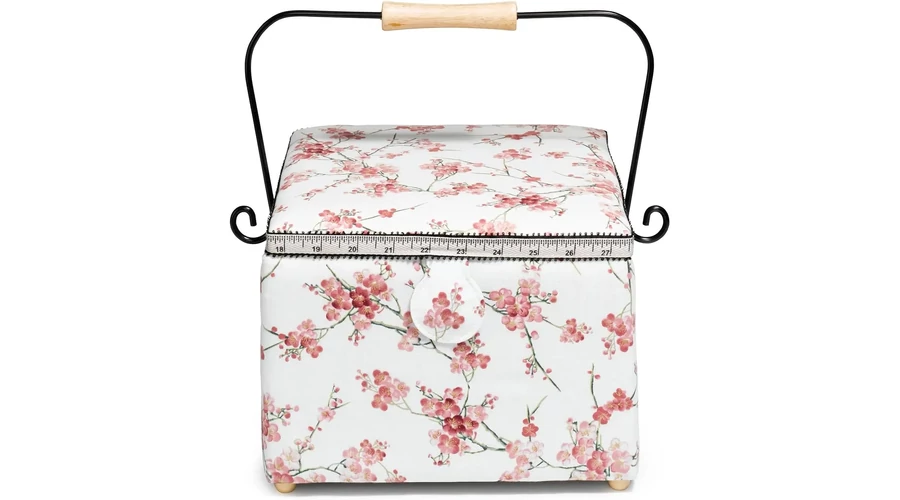 Nagyméretű négyszögles alakú varrókosarat, kézimunka eszközök szállításához és tárolásához ajánljuk. Virágdíszekkel, finom színekkel, elegáns ívelt vastartóval, tágas belsővel rendelkezik. A belső teret bordó színű szövet béleli.