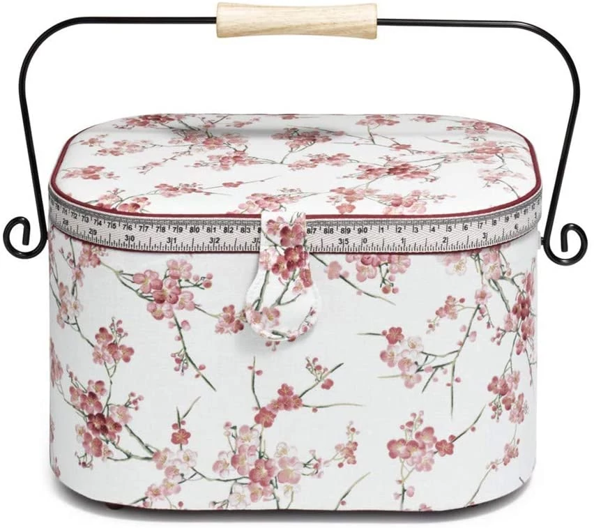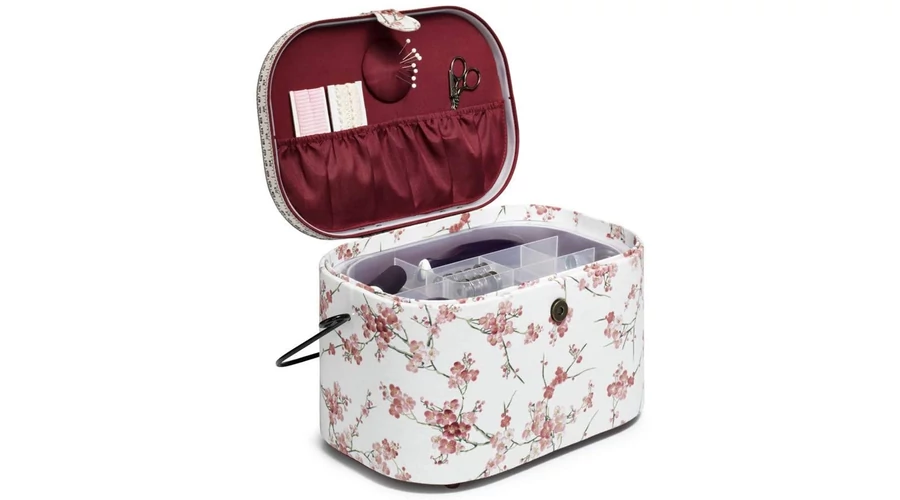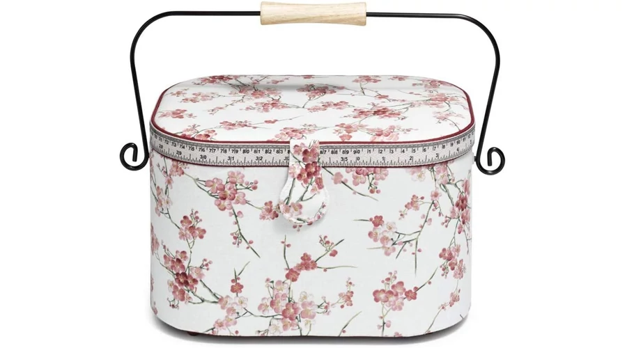Ovális alakú varrókosár szállításhoz és tároláshoz. Virágdíszekkel, finom színekkel, elegáns ívelt vastartóval, tágas belsővel rendelkezik. A belső teret bordó színű szövet béleli.