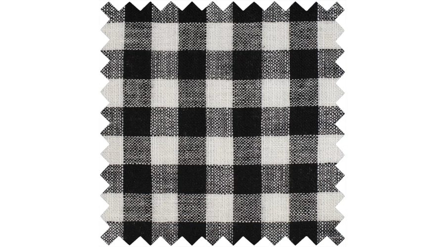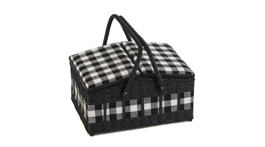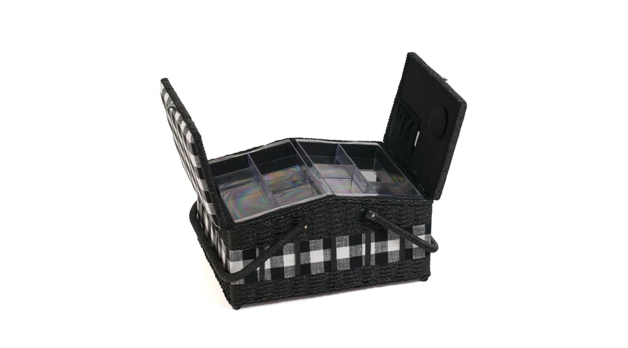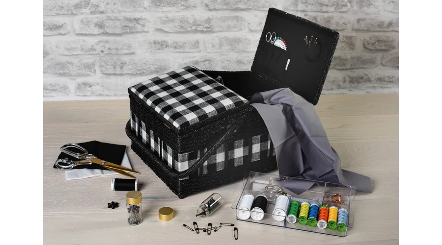 Hobby Gift varrókosár könnyű fából készült, melyet kívülről fekete-fehér mintás pamut vászon borít, belül pedig egy fekete színű szövettel van ellátva.