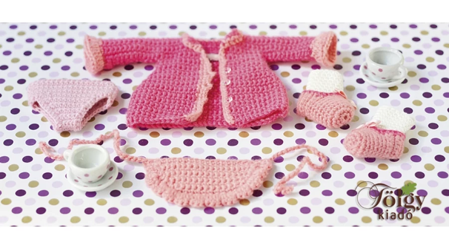 A könyvből horgolhatunk pizsamát, ágyneműt, fehérneműt és hálósapkát, kertésznadrágot, inget, pulóvert, kardigánt, fürdőruhát, kapucnis kabátot, kötényruhát, pelerint, hét különböző jelmezt.