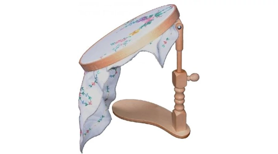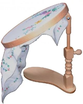 Ráülős hímzőráma-tartó. A végén egy erős tartóval, melyre egy 20 cm átmérőjű hímzőráma van erősítve. Fa állítható magasságú.