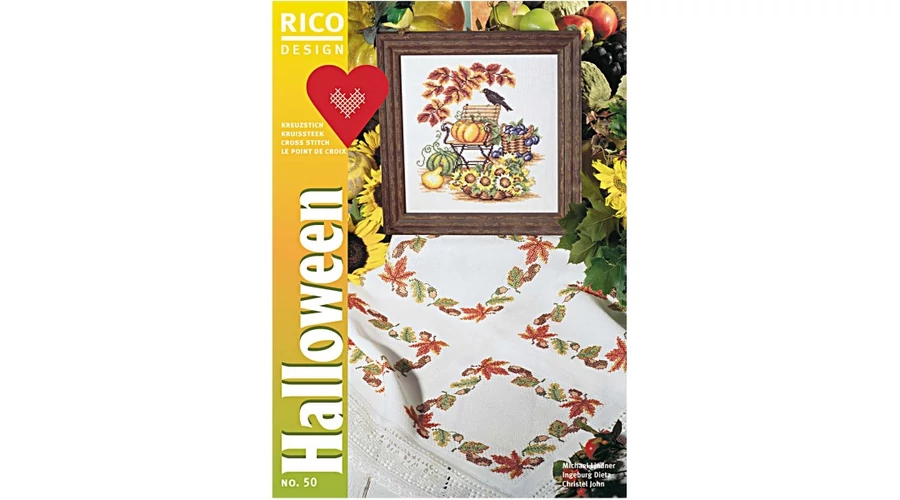 Rico keresztszemes mintafüzetben Halloweennel kapcsolatos sütőtökök, madárijesztők, színes falevelek, boszorkányok mintája található.