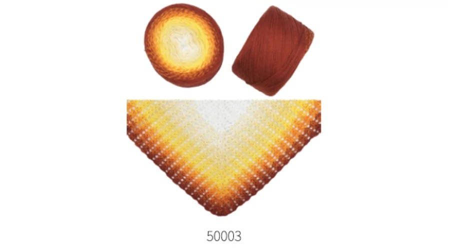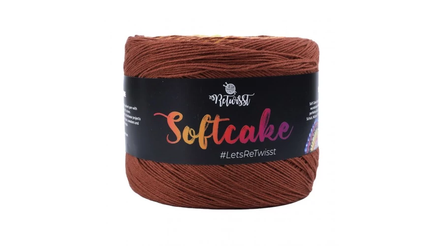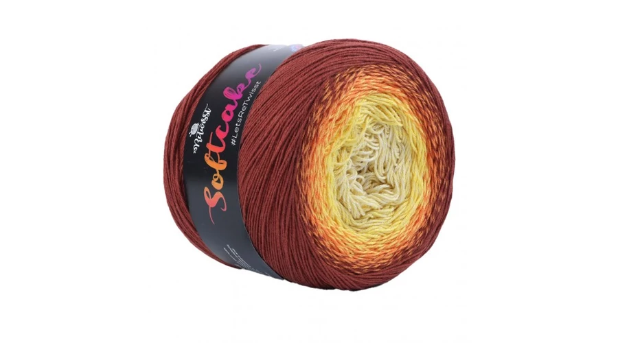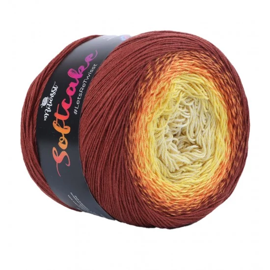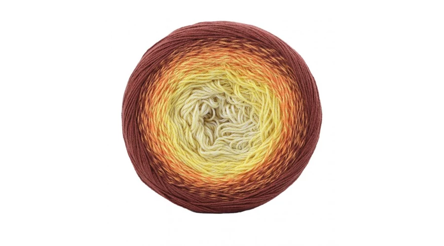 Retwisst Soft Cake 4 szálas színátmenetes sütifonal. Rozsdabarna, narancs, sárga, ekrü színek kombinációja.