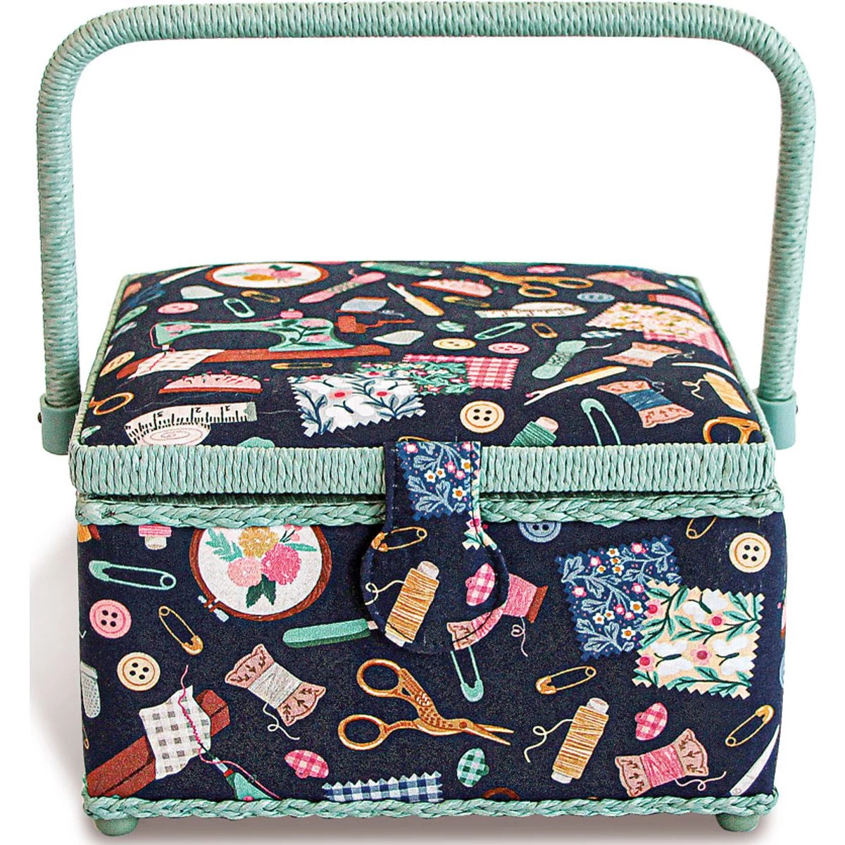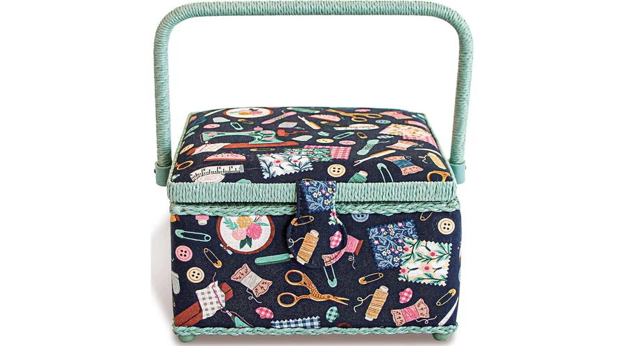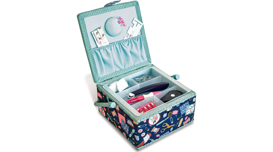 Prym közepes méretű varródoboz kisebb kézműves kellékek tárolására tökéletes! A varrókosár szögletes, és szövetborításának köszönhetően igazán vonzza a szemet. Belseje kivételesen praktikus kialakítású, mivel a kivehető műanyag betét két hosszú és két rövid rekesszel rendelkezik a különböző kiegészítők, például tűk, gombok, jelölőceruzák vagy cérnák számára. Ezenkívül a fedél alsó részére két szövetzseb van varrva, amely helyet biztosít ollónak, mérőszalagnak és még sok másnak. A varrókosár megemelt lábakkal rendelkezik, amelyek megakadályozzák az anyag beszennyeződését. A széleket és a fogantyút kosaras díszítés díszíti.